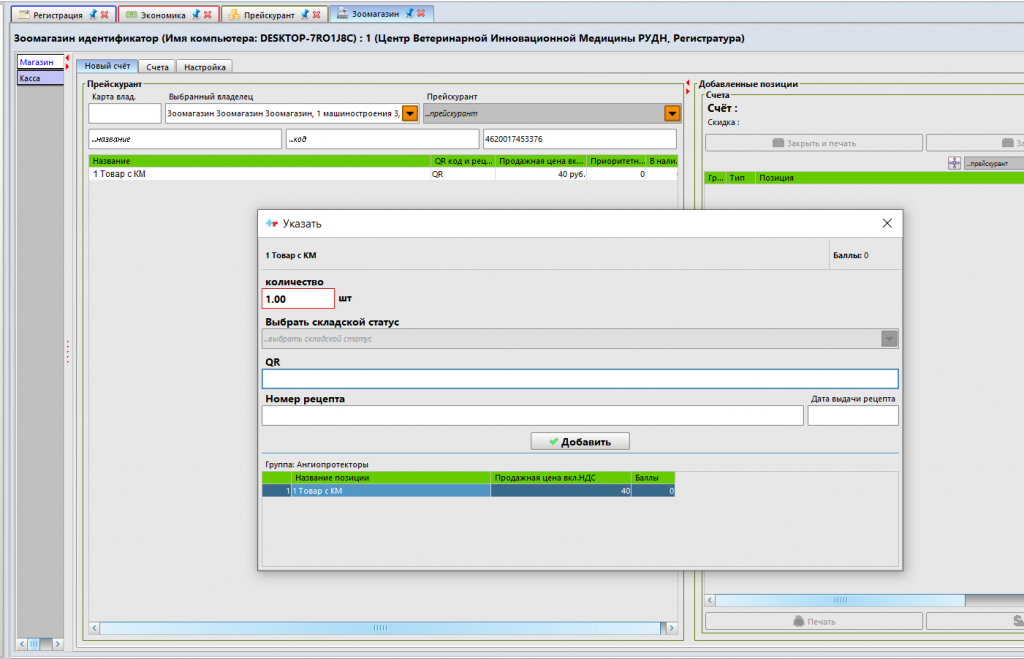 Если товар подлежит рецептурному отпуску и в карте товара существует данная настройка, необходимо перед добавлением товара также указать номер рецепта и дату выдачи.