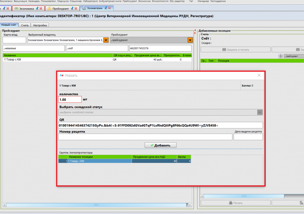 2. Сканируем сканером штрихкод товара, и если штрихкод добавлен в карте товара в настройке складской карты, автоматически открывается окно добавления позиции в счет. Курсор по умолчанию активный в окне QR и готов к вводу кода маркировки.