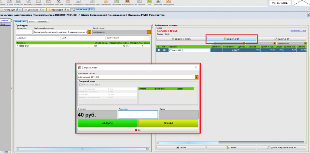 4. После добавления позиции в счет, либо сканируем следующий товар или закрываем счет и нажимаем кнопку «Закрыть счет» и выбираем способ оплаты. В зависимости от настроек чек напечатается автоматически либо необходимо нажать кнопку «Печать» и выбрать печать чека.